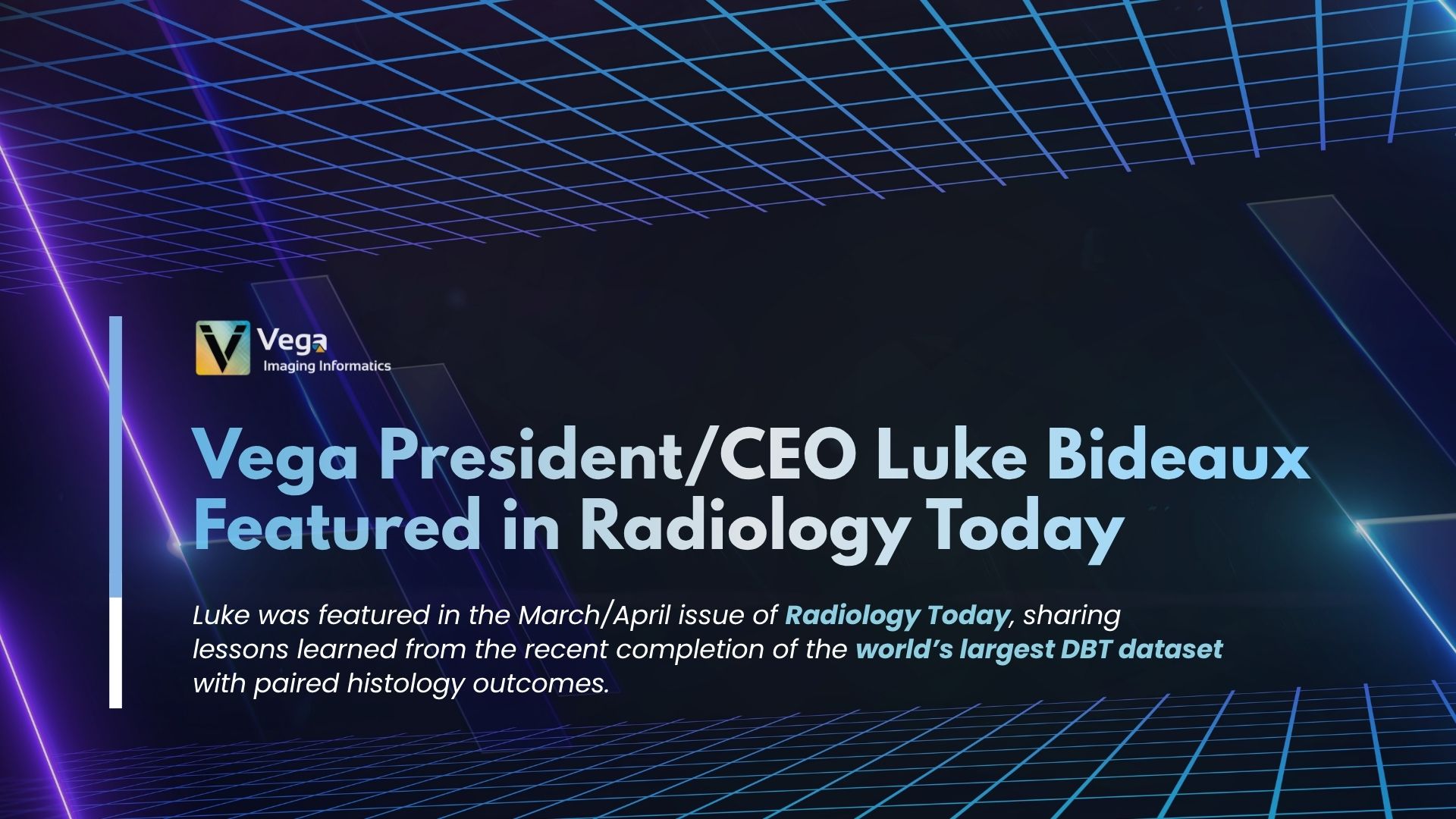 Vega Imaging Informatics President and CEO, Luke Bideaux, was featured in the March/April issue of Radiology Today, sharing lessons learned from, along with the significance of, the company’s recent completion of the world’s largest Digital Breast Tomosynthesis (DBT) dataset with paired histology outcomes.